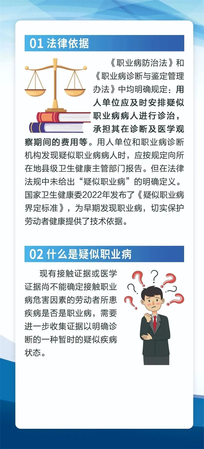 保護勞動者健康,一起了解疑似職業(yè)病的概念定義、法律依據(jù)、界定標準、處理原則、在界定疑似職業(yè)病過程中的注意事項,以及疑似職業(yè)病病人依法享有的權(quán)益。
